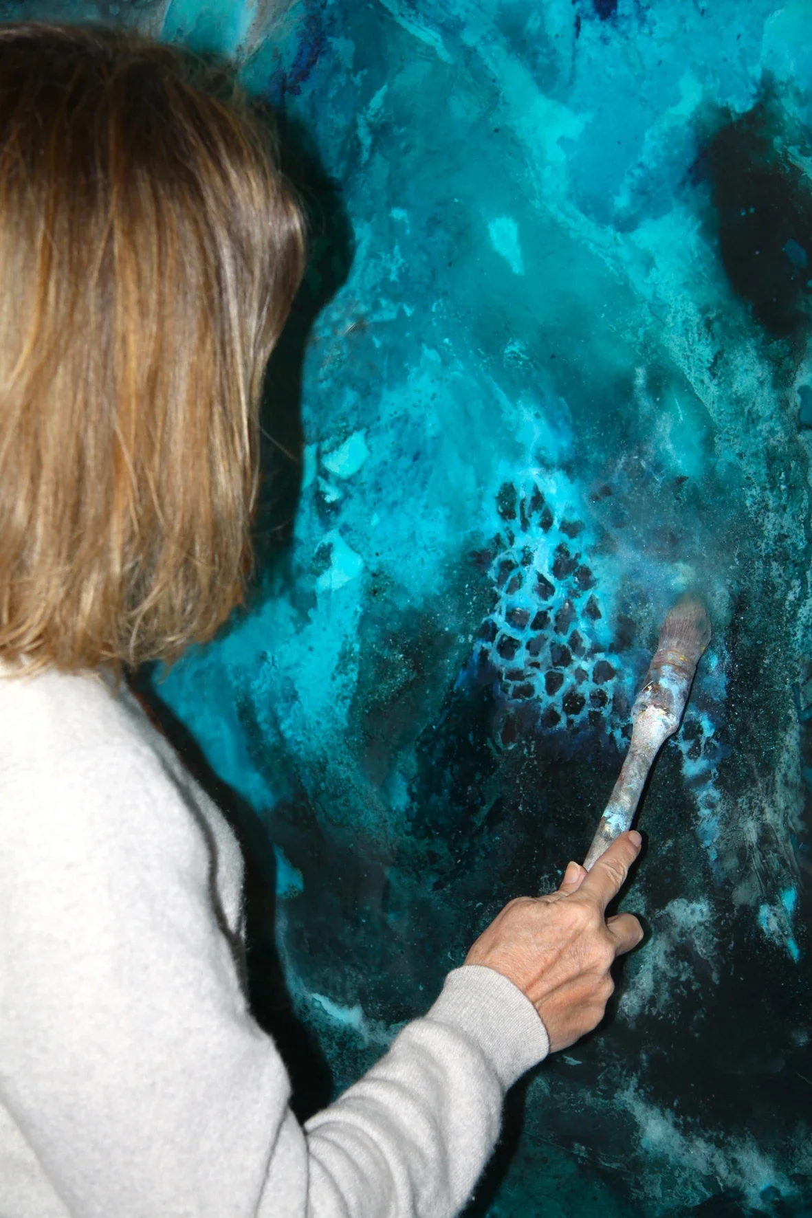 Je m’exprime avec les matières et les glacis de sorte que s’opposent et se répondent liquide et solide, mat et brillant. De la chaux à la résine, en passant par les encres, les pigments, le sable et le mica, les papiers froissés et collés…je compose en m’autorisant tous les mélanges de matières possibles pour faire résonner la couleur.